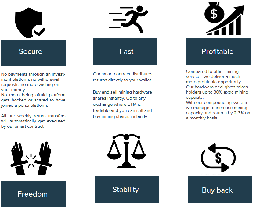 ETHernitymining tạo ra một môi trường mật mã ổn định hơn hoặc ít ổn định hơn cho mã thông báo của chúng tôi để phát triển giá trị một cách vững chắc. Các thẻ ETM được gắn trực tiếp với phần cứng khai thác mỏ và sẽ tăng giá trị tương tự như năng lực của chúng tôi sẽ làm. Bên cạnh giá trị đầu cơ trên các sàn giao dịch ETM cũng sẽ có một giá trị gắn liền với tổng giá trị của phần cứng khai thác mỏ của chúng tôi. Bằng cách này, các nhà đầu tư sẽ có một số sự đầu tư ổn định.