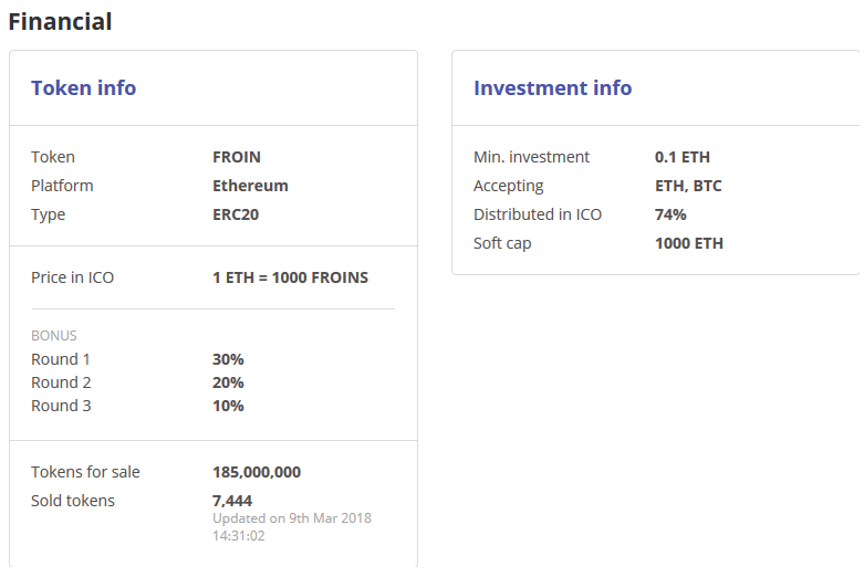 185.000.000 (một trăm tám mươi lăm triệu / 74%) froins sẽ được cung cấp cho công chúng. Việc này sẽ được thực hiện trong thời kỳ ICO trước và ICO. Điều này bao gồm các phần tử cung cấp như là tiền thưởng trong ICO. Bất kỳ mầm nào chưa bán trong thời gian này sẽ không được tạo ra (đốt).