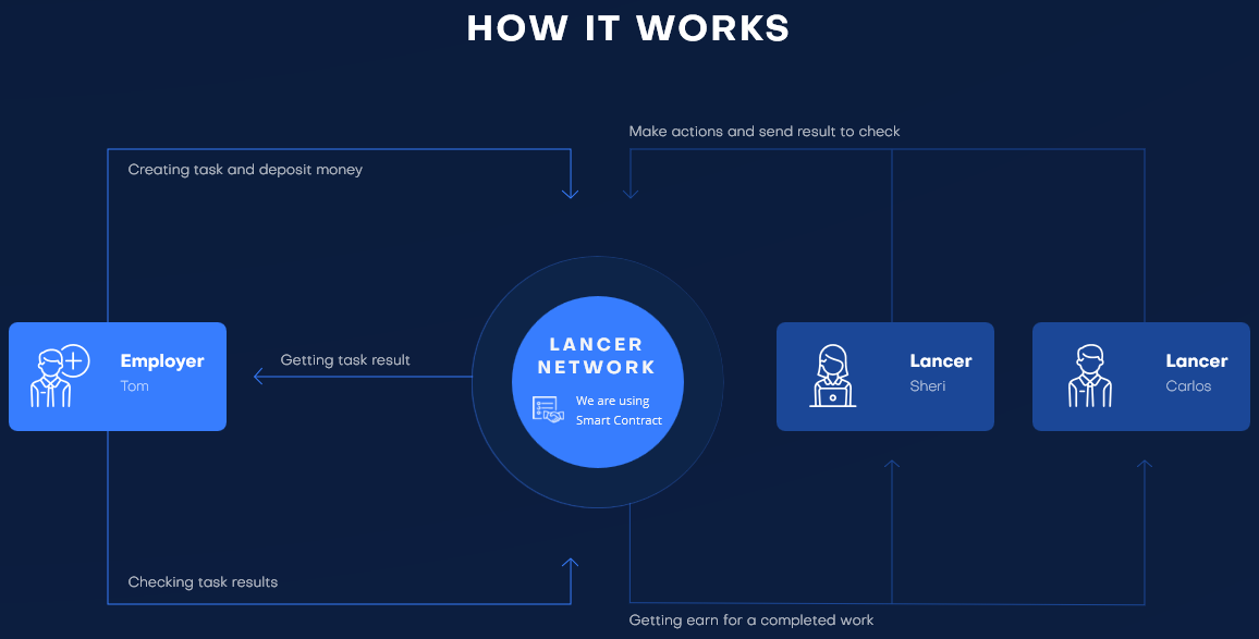 Sau khi phân bổ hoàn tất, mã thông báo Lancer sẽ được khấu trừ từ tài khoản Lancer của Mark. Tùy thuộc vào điều kiện của công việc, người dùng có thể được chỉ định một cách tự động bởi người thực hiện hoặc điều này có thể được xác nhận thủ công. Sau đó, người biểu diễn có thể bắt đầu nhiệm vụ. Tại cuối cùng, lancer phải cung cấp một báo cáo về việc thực hiện nó. Chỉ sau khi xác minh và phê duyệt các nhiệm vụ của Mark, người biểu diễn có thể nhận thanh toán.